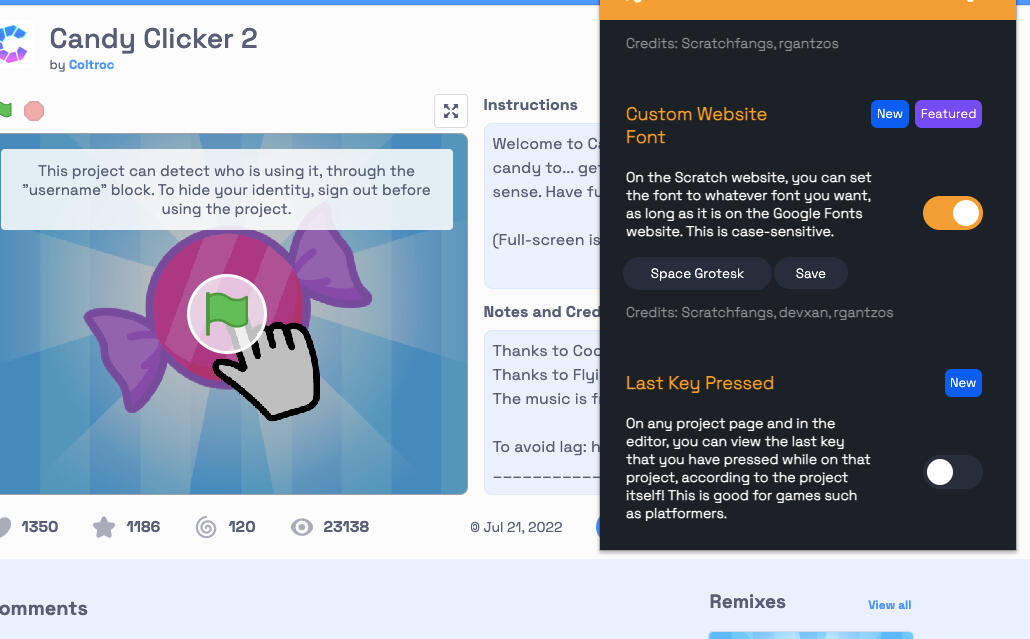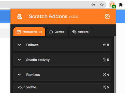 Scratchtools is another extension with a large set of Scratch modifications. It's smaller than Scratch Addons, but updates are pushed out more frequently. Some of the best features are More Editor Fonts, Project Idea Generator, Colored Messages, Custom Site Font, & Project Link as Title.