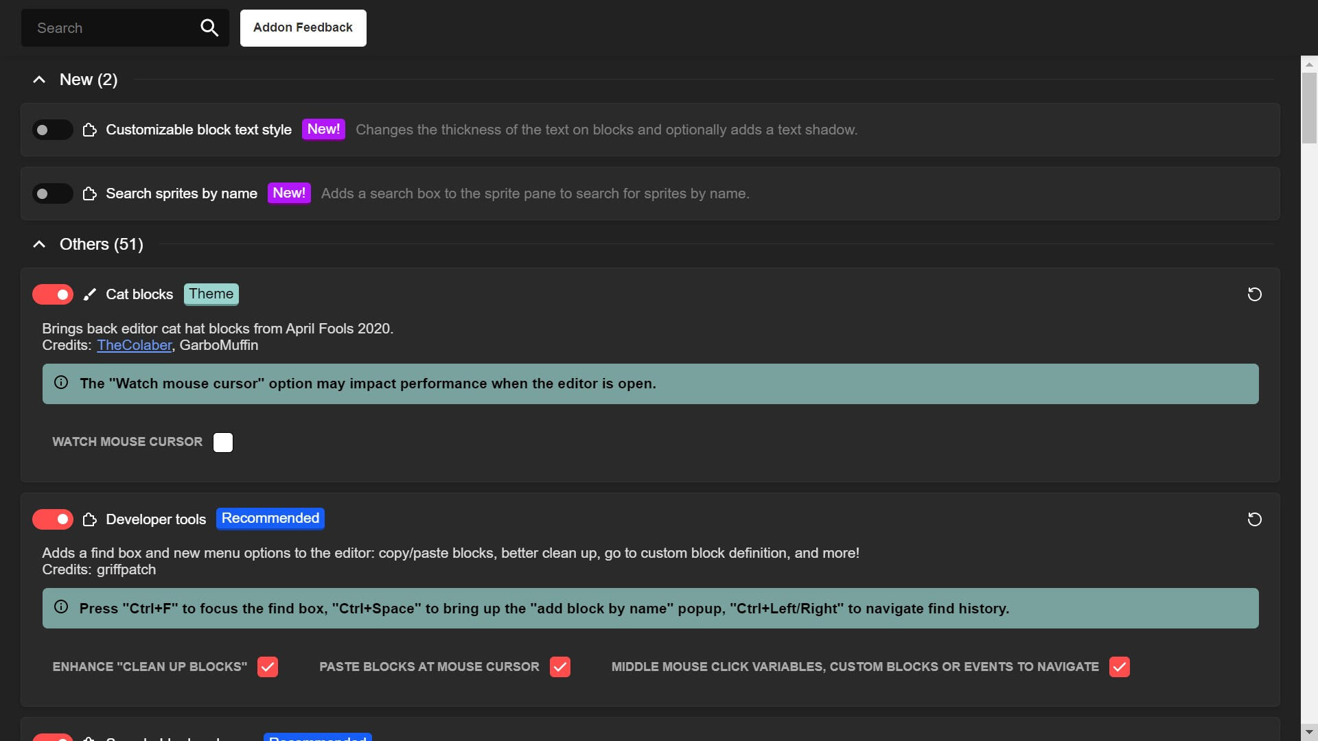 Some of our favorite addons are Developer tools, 60FPS project player mode, Thumbnails setter, Editor dark mode and customizable colors, Pause button, Website dark mode and customizable colors, & Block switching. (Most users use a lot more, but listing them all would be way too much for this site.)