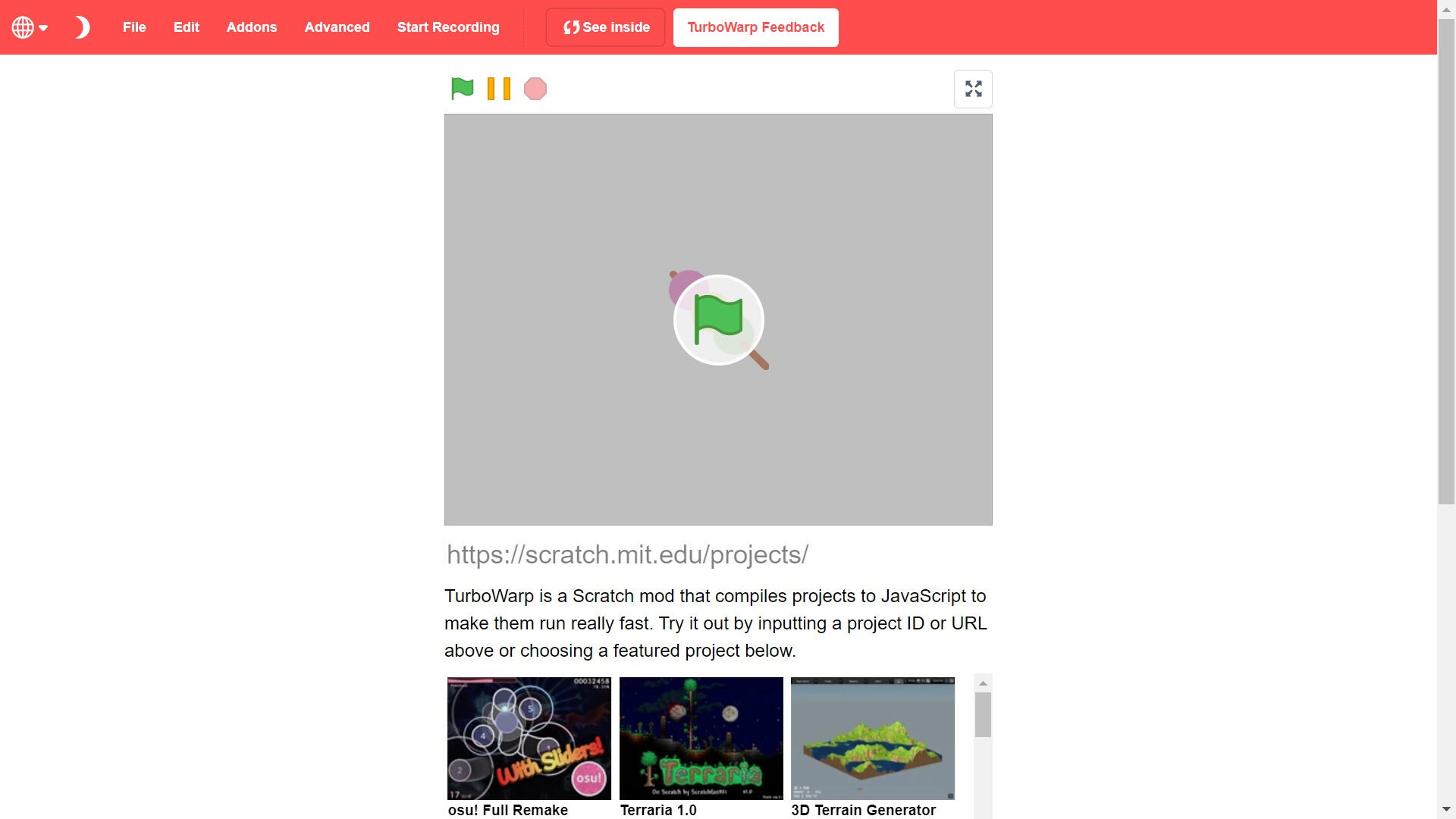 TurboWarp is an external modification of Scratch with improved performance, dark mode, addons (from Scratch Addons - if they affect the editor, they'll most likely be in this), and more. Input any Scratch project URL or ID into the website or load a Scratch project from your computer. It has a packager for downloading projects as apps or websites. You can also download it as a standalone app to get its spectacular additions offline.